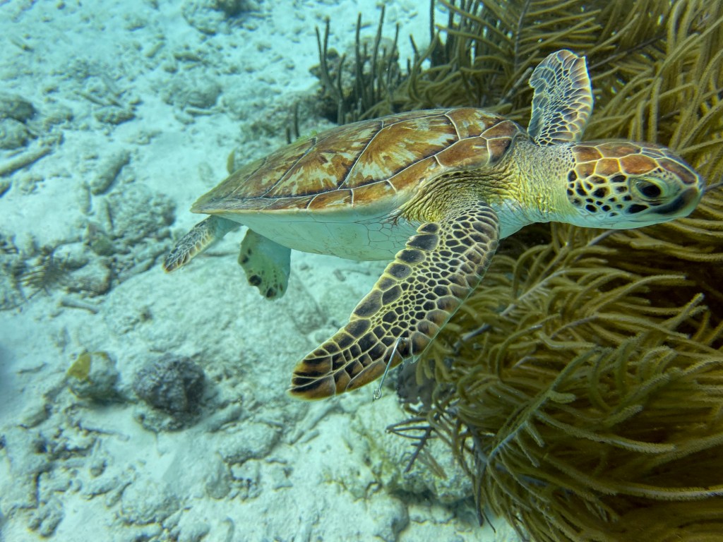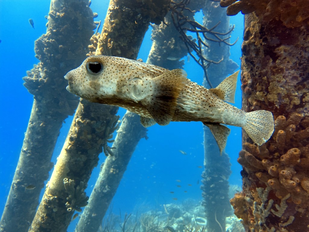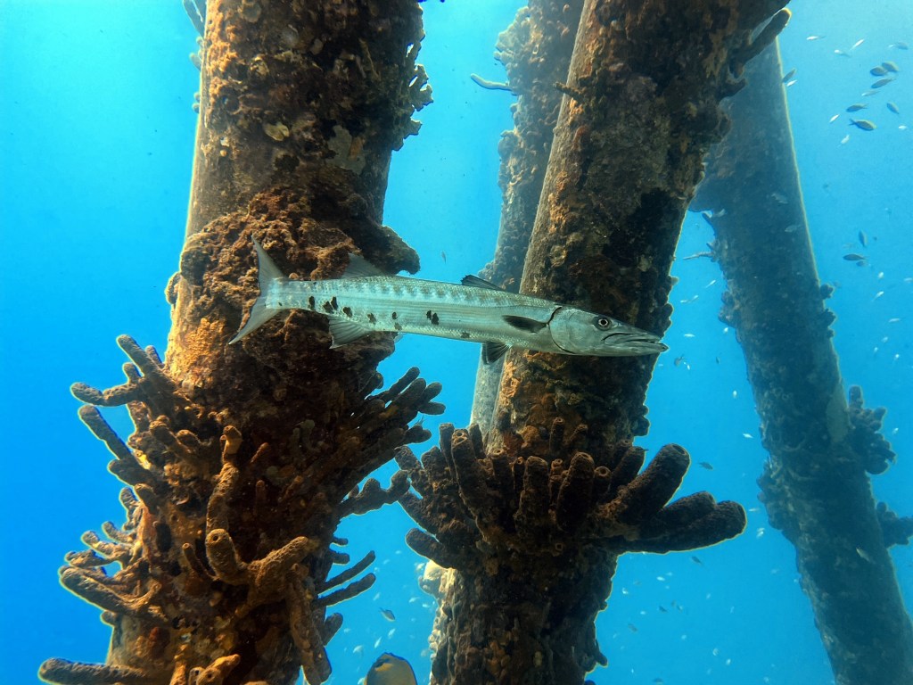 After a quick breakfast and loading the trucks, we drove the short journey to Salt Pier, and working pier for loading salt onto the ships, from the slat lakes. We checked to see if the dive site was open, as it is shut when a ship is due or alongside the pier. Wow, what a dive. You start by swimming across a sandy bottom and here you can find juvenile turtles, just swimming and playing with each other. Once you start to reach the pier and the reef drop off, you start to notice all the shoals of fish clustered around the pillars of the pier. Swimming over the drop off we found a few tarpons and barracudas swimming along the reef wall. This was my favourite dive site of the week.