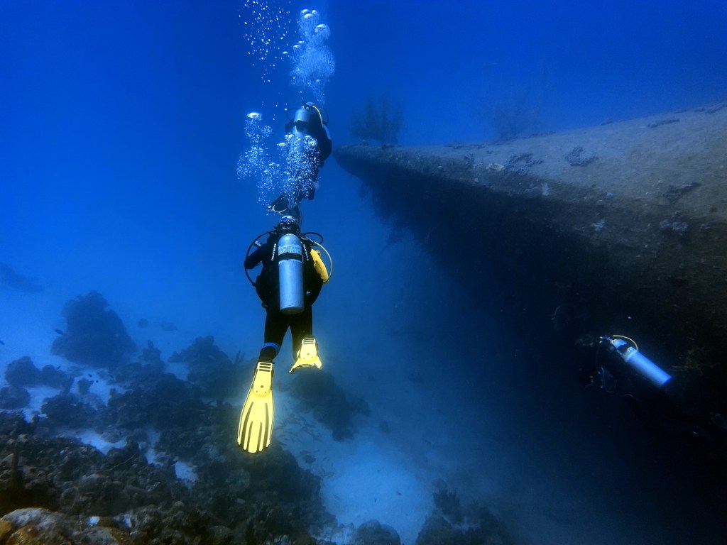 We surfaced, changed our cylinders and drove to our 2nd dive site of the day, the wreck of the Hilma Hooker. Again, there was a short swim across the sandy bottom before heading over the reef. As we descended, we noticed the bow of the wreck coming into focus. The Hilma Hooked lays on her starboard side with her bottom to the reef wall. Its an interesting wreck with easy swim throughs and plenty of wildlife.